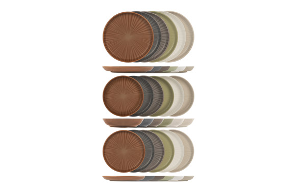 Servicio de mesa de 18 piezas Universe, estilo nórdico, en gres, colores surtidos. Compuesto por 6 platos llanos de 26 cm, 6 platos hondos de 20,5 cm y 6 platos de fruta de 20 cm. Apto para lavavajillas y microondas. .
